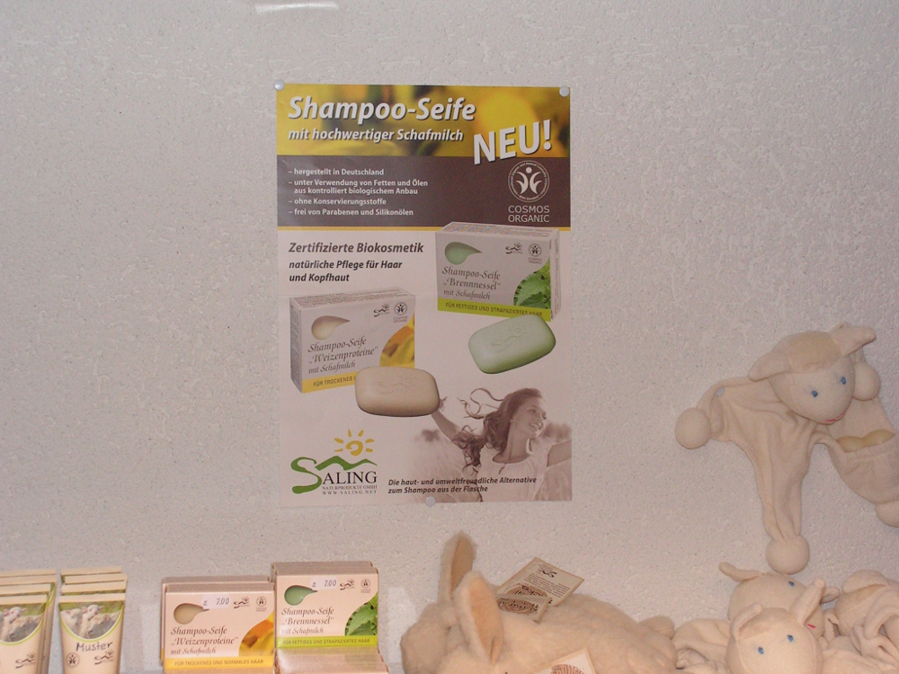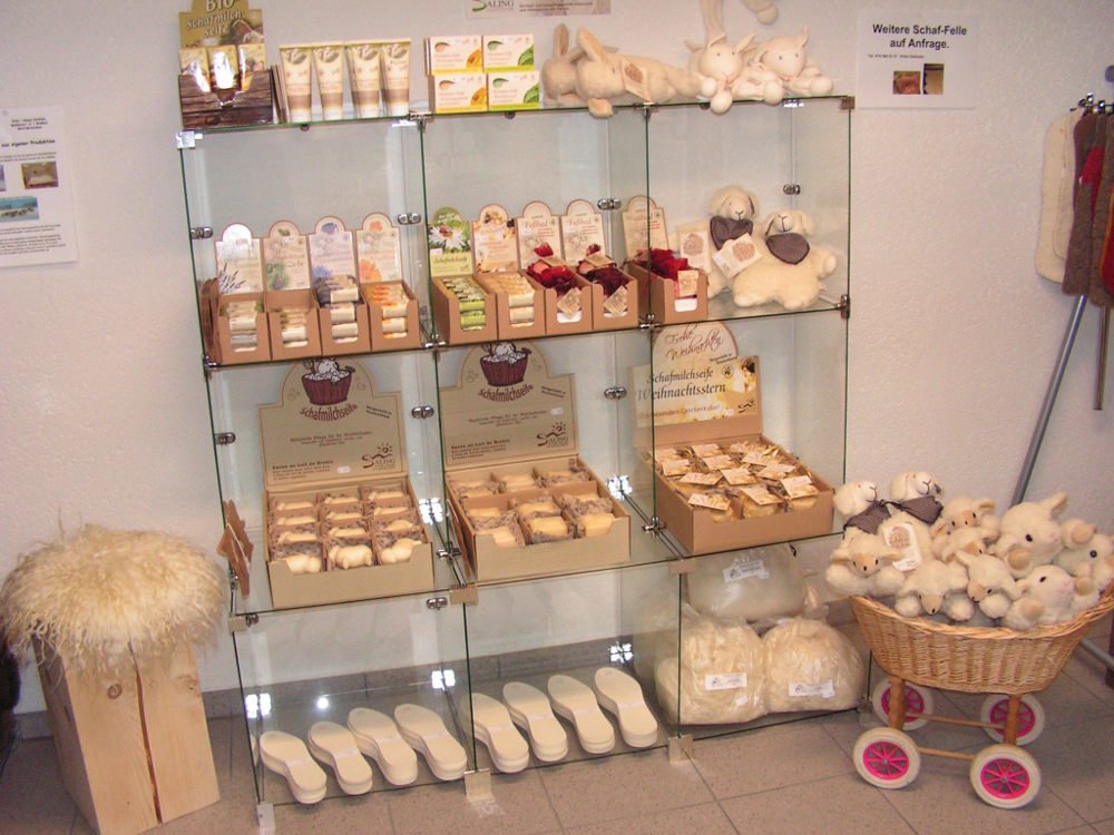 Im Hofladen sind auch Schafmilchseifen in verschiedenen Duftnoten, Lanolinprodukte für Körperpflege und Felle von eigenen Schafen oder aus der Umgebung.